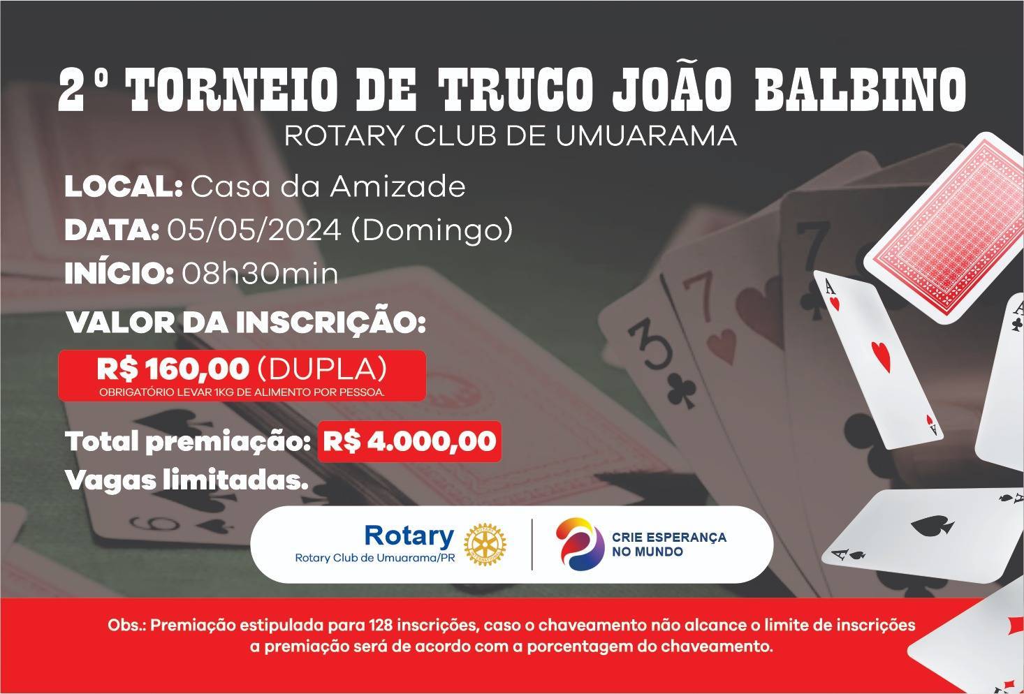 Vem aí nosso 2º Torneio de Truco, corre fazer suas inscrições. ♣️ Faça parte desse dia incrível que confraternizamos, brincamos e nos divertimos. 🤜🏽🤛🏽 Além de tudo isso, toda a renda arrecada é revertida para ações sociais para nossa comunidade. 🤝🏽 Partiu bater aquele carteado no ROTARY.